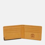 Es una cartera plegable de cuero para hombre de la marca Timberland con detalles en contraste. El cuerpo principal de la billetera es de un color similar al ocre o trigo, mientras que el borde inferior es de un cuero más oscuro.